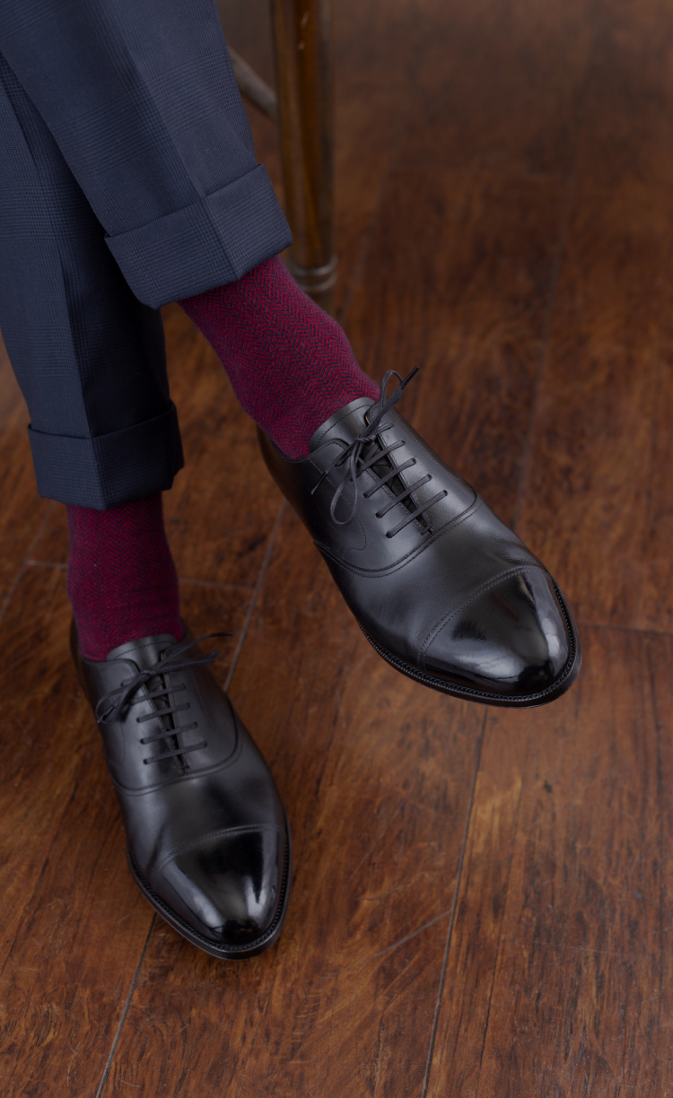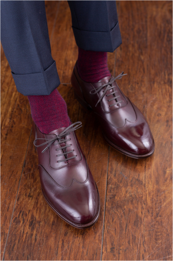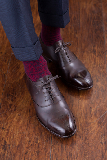 17世紀後半にオックスフォード大学の学生たちがブーツ型の靴を短靴にして紐を通して履いたのが始まりとされ、デザイン的に非常にフォーマルなものとされています。中でも黒のストレートチップは公式な場所で使用するのに最適とされています。 -