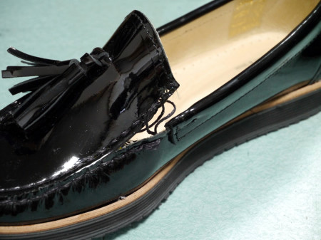 ほつれたモカシンのステッチに対し、モカ全体を解き、縫い直した修理事例です。